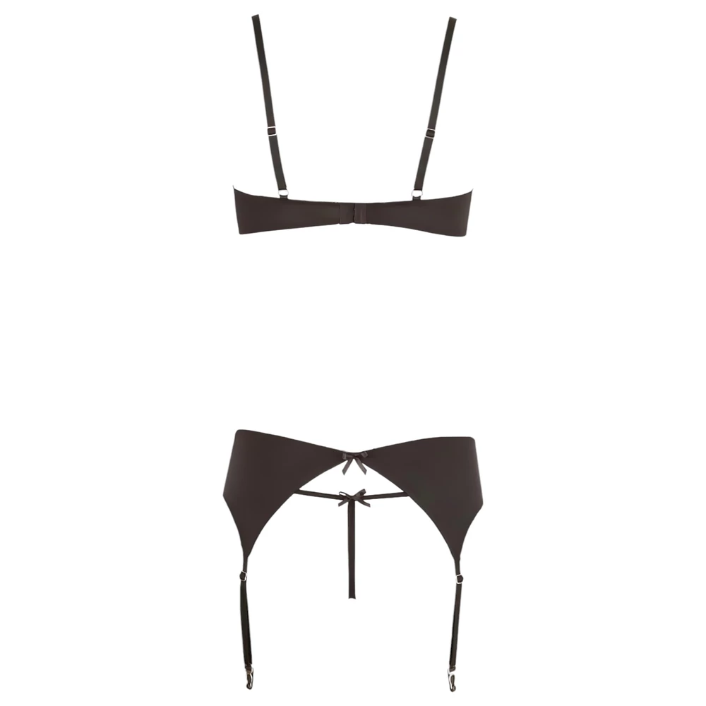 A mellemelő kialakítás gyönyörűen kiemeli a kebleket, miközben a strasszkövek ragyogása luxus megjelenést kölcsönöz. A szettben található nyitott tanga és állítható harisnyatartó pikáns és elegáns egyszerre. Tökéletes választás romantikus estékre vagy ajándéknak egy különleges alkalomra.
