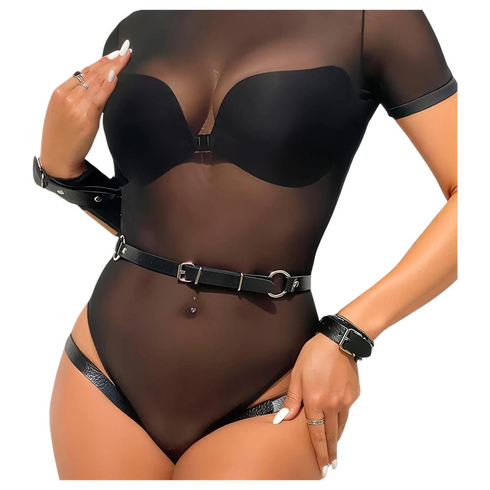 Az Adalet Jimena vegán bőr hám bilincsekkel a fehérnemű és a bondage izgalmas keveréke, amely egyszerre erotikus és funkcionális kiegészítő.
