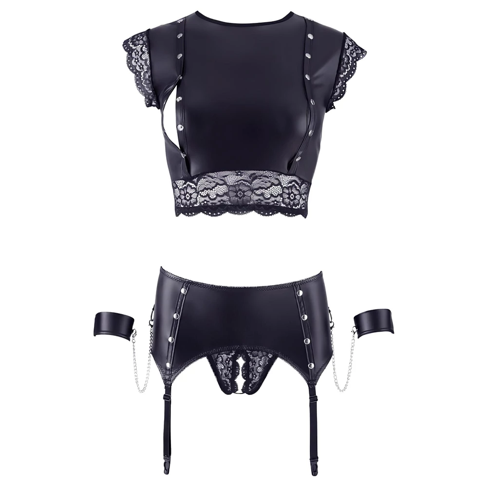 - Izgalmas kiegészítők: A fém gyűrűk, szegecsek és láncok nemcsak díszítik a szettet, hanem lehetőséget adnak a kreatív és szenvedélyes együttlétekre.