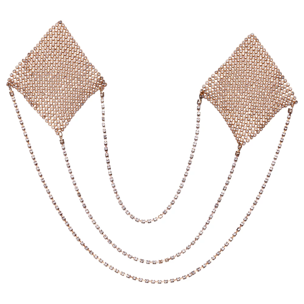 Ez a látványos, gyémánt formájú bimbómatrica fényes, csillogó ezüstszínben pompázik, és három finom, mozgó lánccal díszített, amelyek izgalmasan követik minden mozdulatod. A bőrbarát, bio-adhéziós ragasztó kényelmes viseletet biztosít, és a matricák többször is használhatók, ha a védőfóliát minden használat után visszahelyezed. Elegáns, mégis merész kiegészítő fehérneműhöz, előjátékhoz vagy színpadi megjelenéshez.