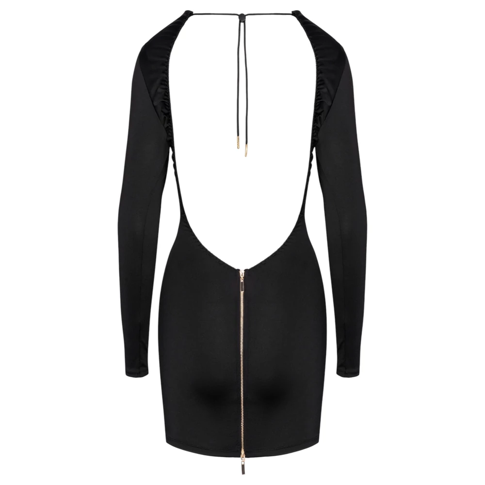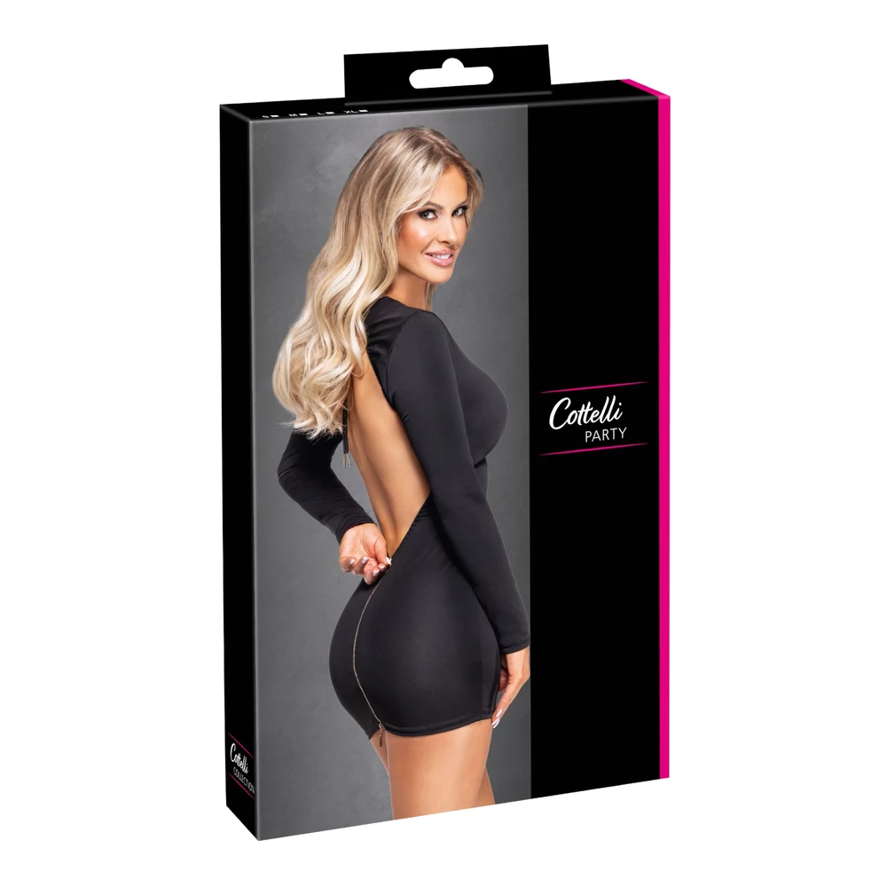A Cottelli Party fekete, hosszú ujjú miniruha egyszerre elegáns és provokatív – letisztult elöl, hátul pedig igazán lélegzetelállító.