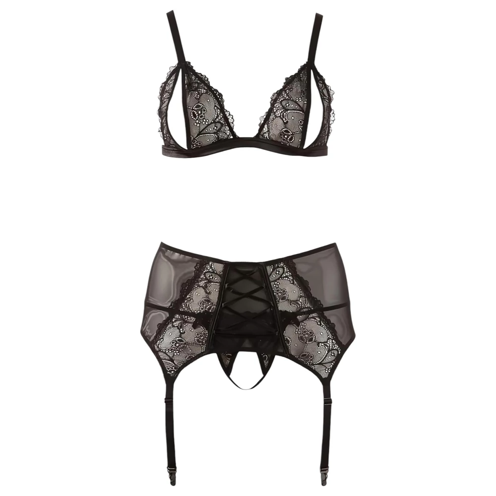 - Csábító dizájn: A kebleket szabadon hagyó, nyitott melltartó és az elöl szatén fűzős díszítésű harisnyatartó fokozza az érzéki megjelenést.