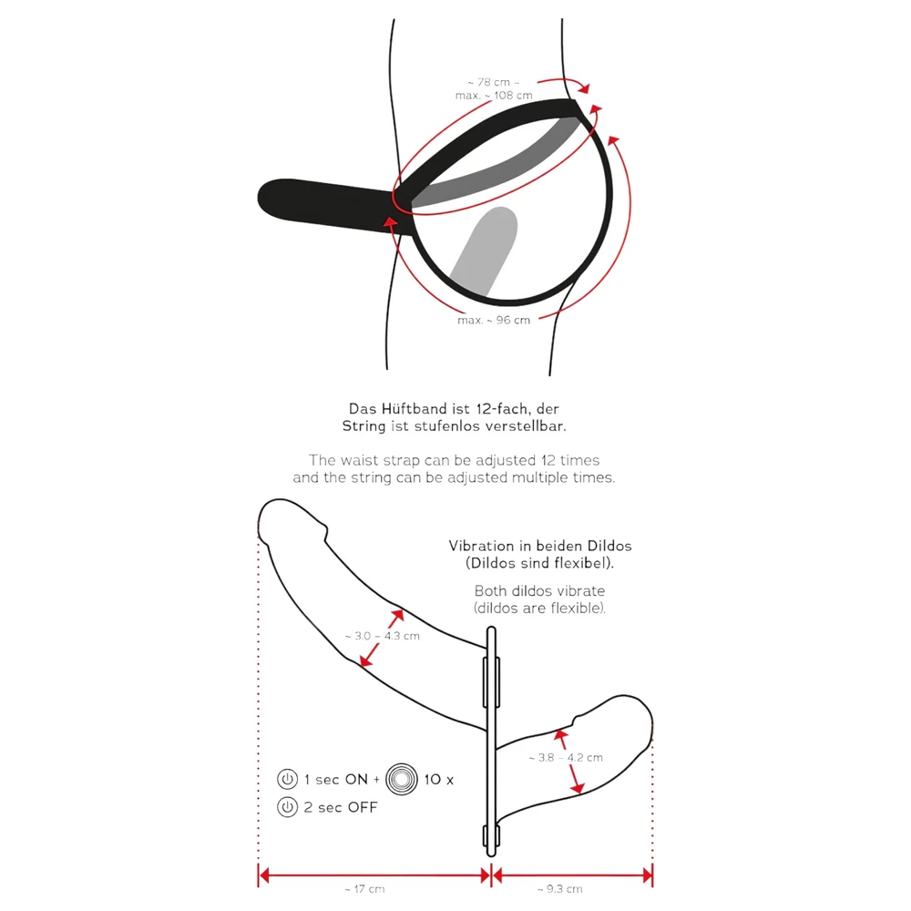 - Anyagok: ABS (vezérlő), Bőr (pántok), Szilikon (vibrátorok) – EU-rendeletnek megfelelő, ftalátmentes