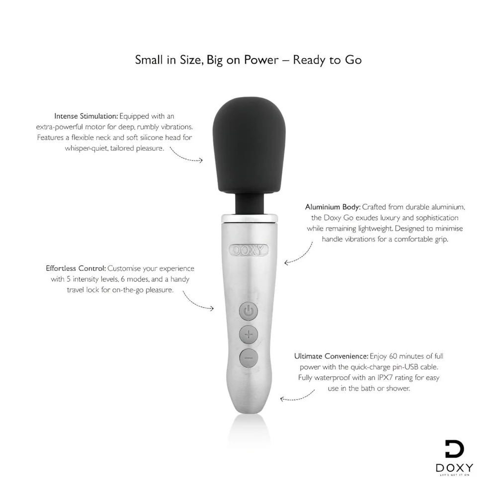 A Doxy Go a márka ikonikus, mély és dübörgő rezgéseit hozza el utazásbarát, kompakt méretben. Mindössze 16 cm hosszú, így 38%-kal kisebb a Die Cast 3-nál, és 55%-kal kisebb a klasszikus teljes méretű változatnál. Az alumínium ház könnyű, tartós és csökkenti a fogantyú vibrációit, így kényelmes használatot biztosít. A 5 intenzitási szint és 6 rezgésminta lehetővé teszi a teljes személyre szabhatóságot, miközben a készülék rendkívül diszkrét, halk és vízálló, így akár fürdőben vagy zuhany alatt is használható.