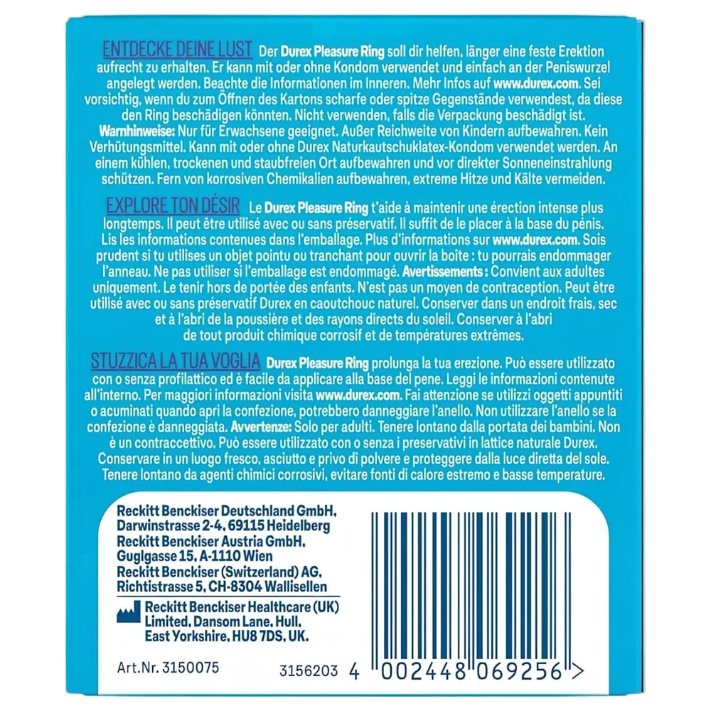 A Durex Pleasure Ring segít abban, hogy hosszabb ideig élvezhesd az együttlétet – merevebb erekcióval, intenzívebb élménnyel. Rugalmas kialakításának és vastag falának köszönhetően hatékonyan tartja fenn a véráramlást, miközben kényelmes viseletet biztosít. Szilikon anyaga bársonyos tapintású, bőrbarát és könnyen síkosítható.