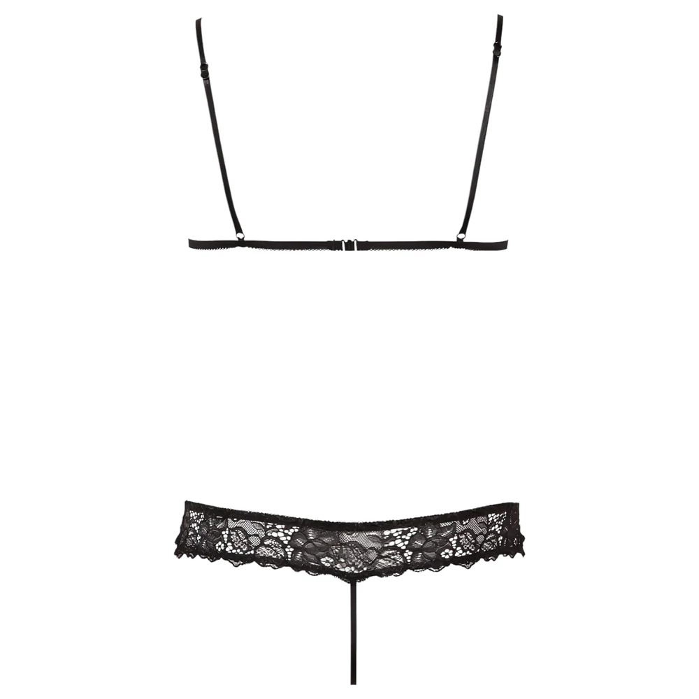 A strasszokkal díszített csipkeszett igazi különlegesség, amely kiemeli nőiességed és magabiztosságot ad. A nyitott alsó rész és a hangsúlyos mellrész egyszerre merész és provokatív, miközben a puha, rugalmas anyag gondoskodik a kényelmes viseletről. A finom csipkeminta elegáns részletgazdagságával fokozza a szett luxus érzetét.