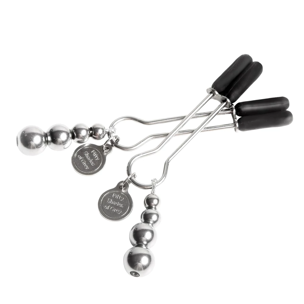 Fedezd fel az érzéki fájdalom és öröm játékát ezzel a prémium minőségű, állítható nyomású bimbószorító szettel. Mindkét csipesz 9 gramm súllyal van ellátva, amelyek finom, fokozatos stimulációt nyújtanak.