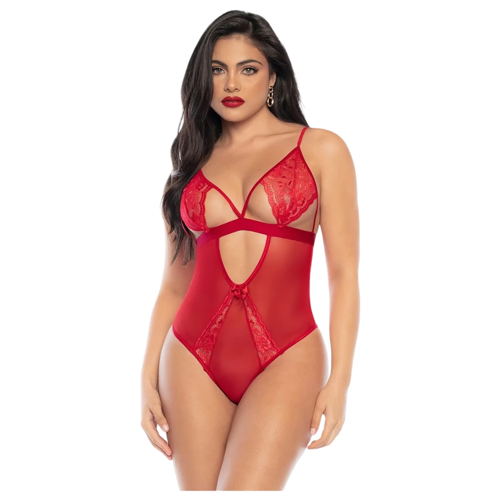- Vadítóan vörös színben készült, aprólékos csipkével gazdagon díszített body