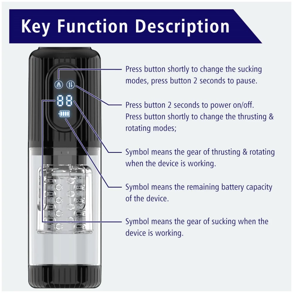 Az ergonomikusan elhelyezett gombokkal egyszerűen szabályozhatod a forgás, lökés és szívás intenzitását, míg a LED kijelzőn könnyen nyomon követheted a beállításokat.