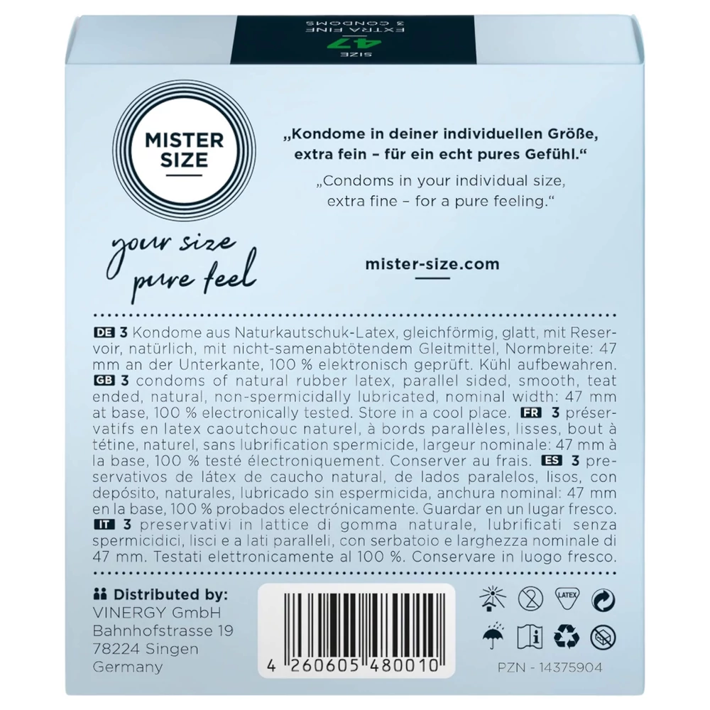 - 3 darab Mister Size óvszer 47 mm-es méretben, külön csomagolva.