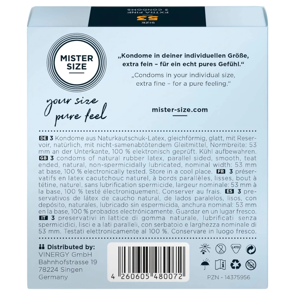 - 3 darab Mister Size óvszer 53 mm-es méretben, külön-külön csomagolva.
