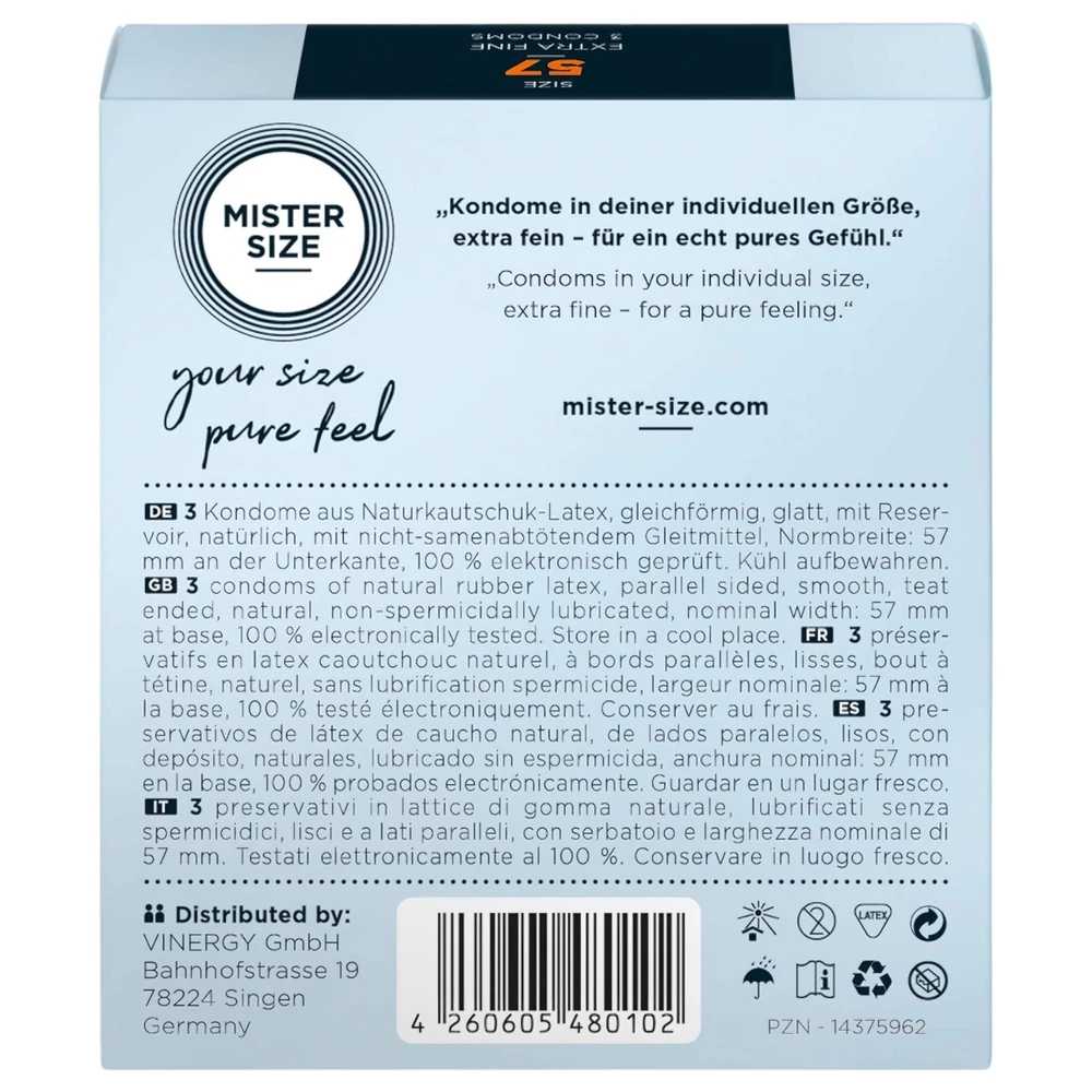 - 3 darab Mister Size óvszer 57 mm-es méretben, külön csomagolva.