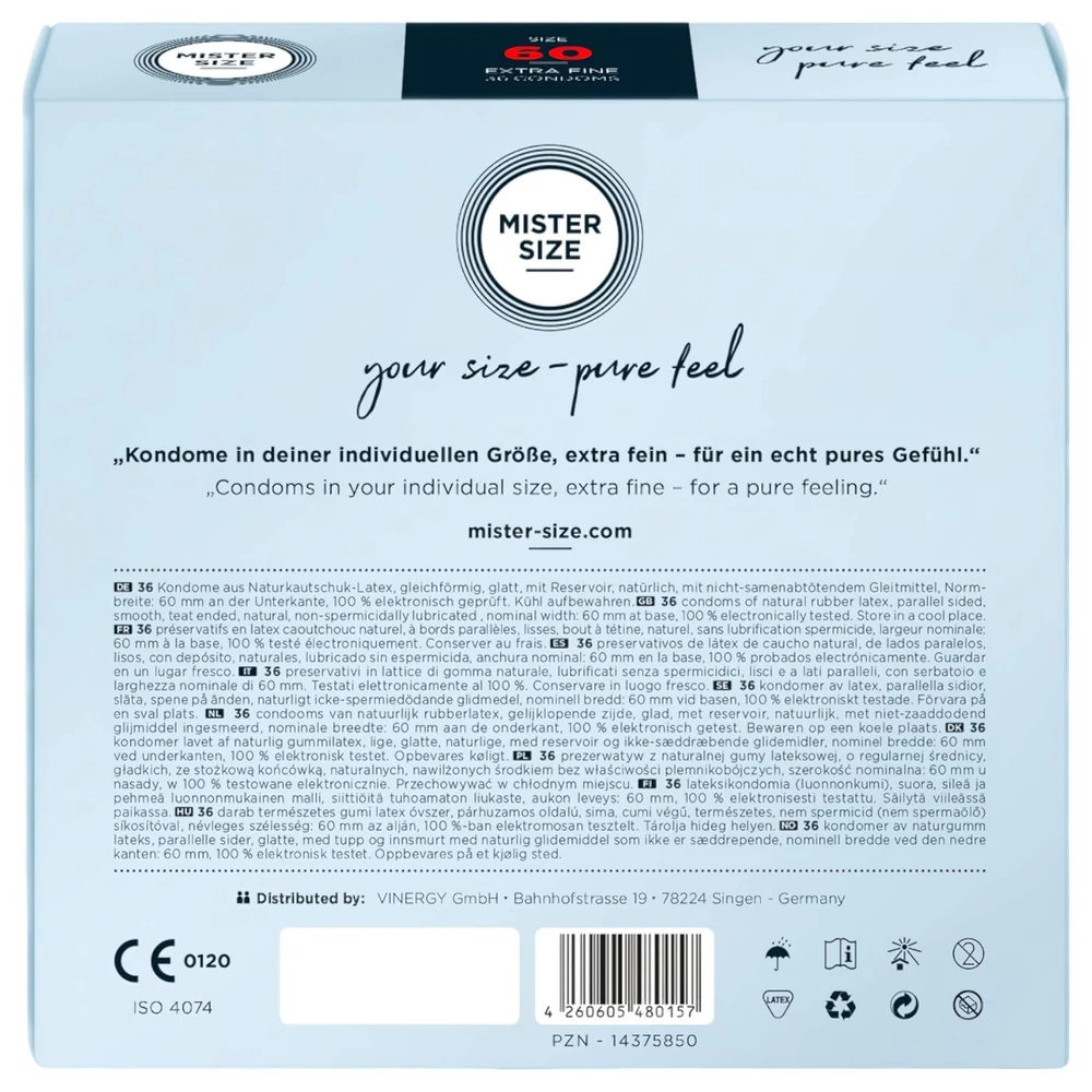 - 36 darab Mister Size 60 mm-es, extra vékony, síkosított óvszer, egyesével csomagolva.