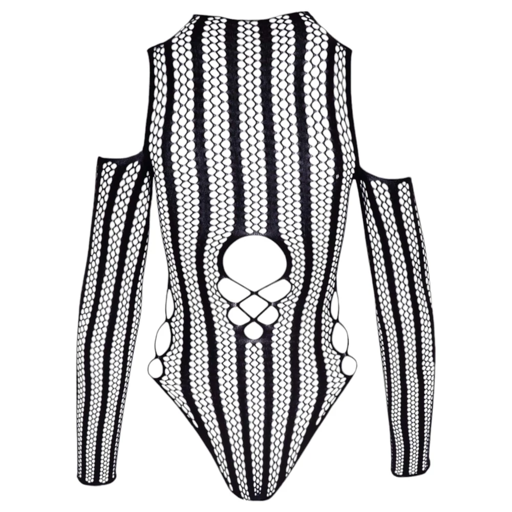 - Kialakítás: nagy szemű háló, hosszú ujjak, zárt szeméremrész