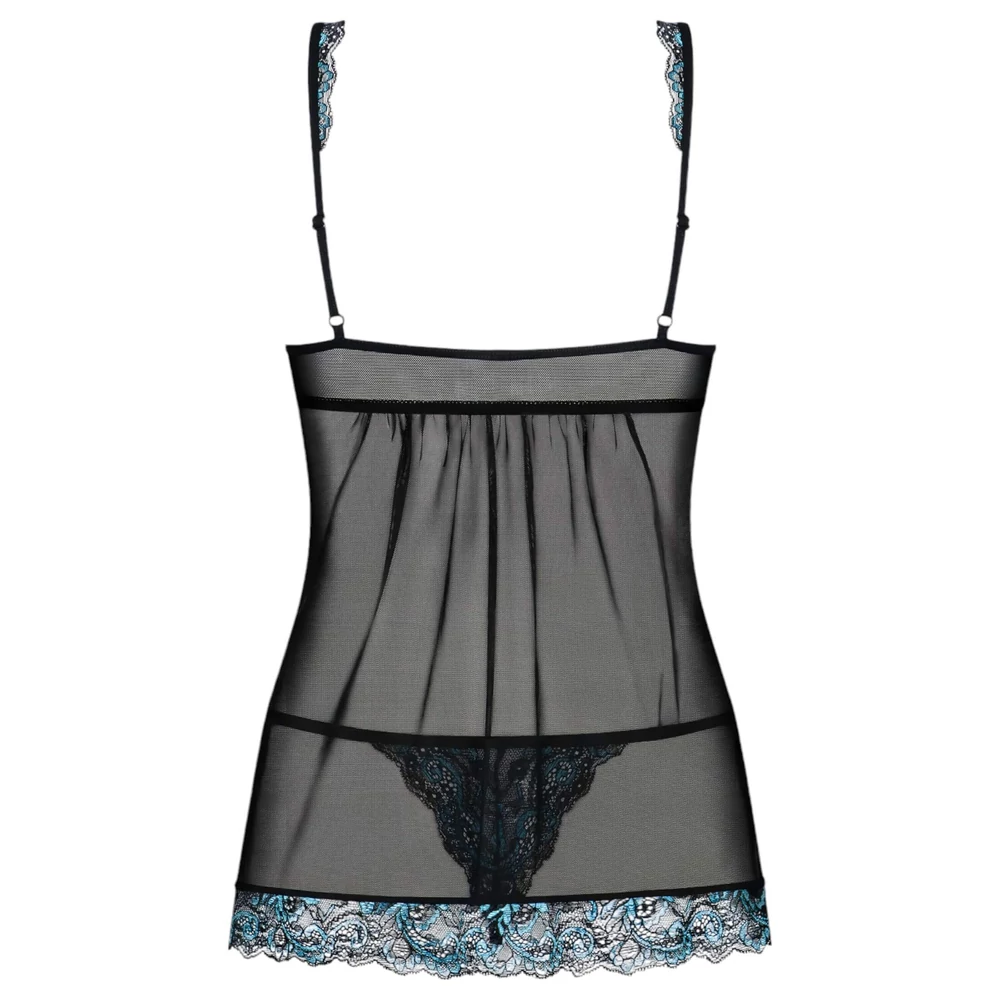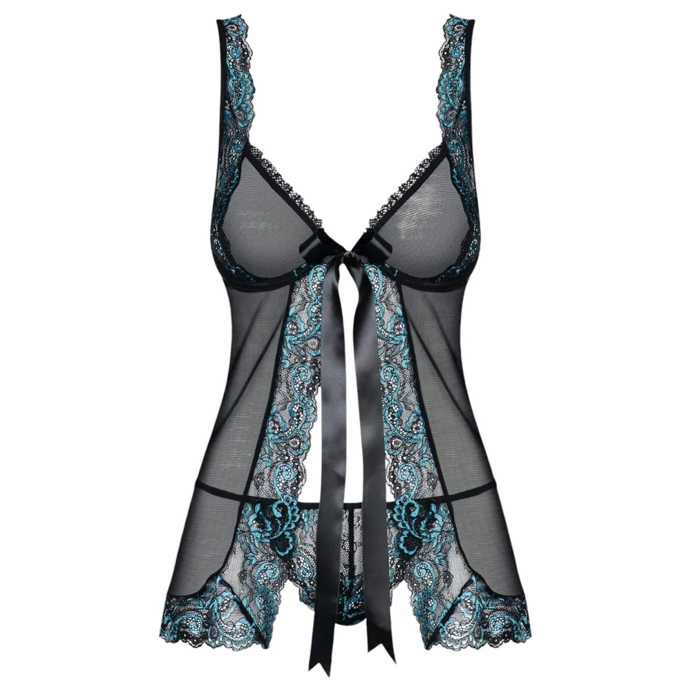 Obsessive Amanta - hímzett babydoll és tanga (fekete-türkiz)