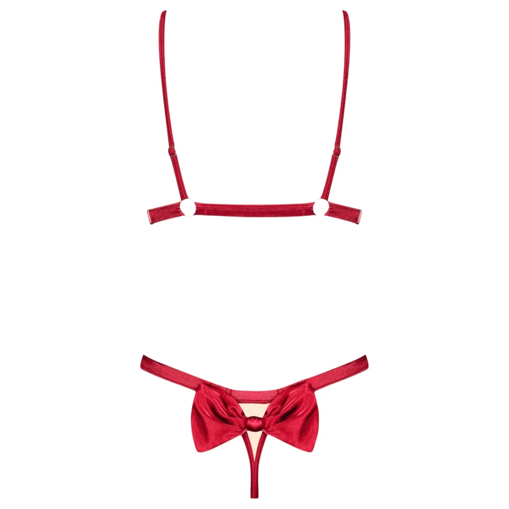 Az Obsessive Rubinesa szett egy érzéki és elegáns fehérnemű összeállítás, amely piros szaténból készült aranyszínű csillogással, nyitott-masnis kialakítással.