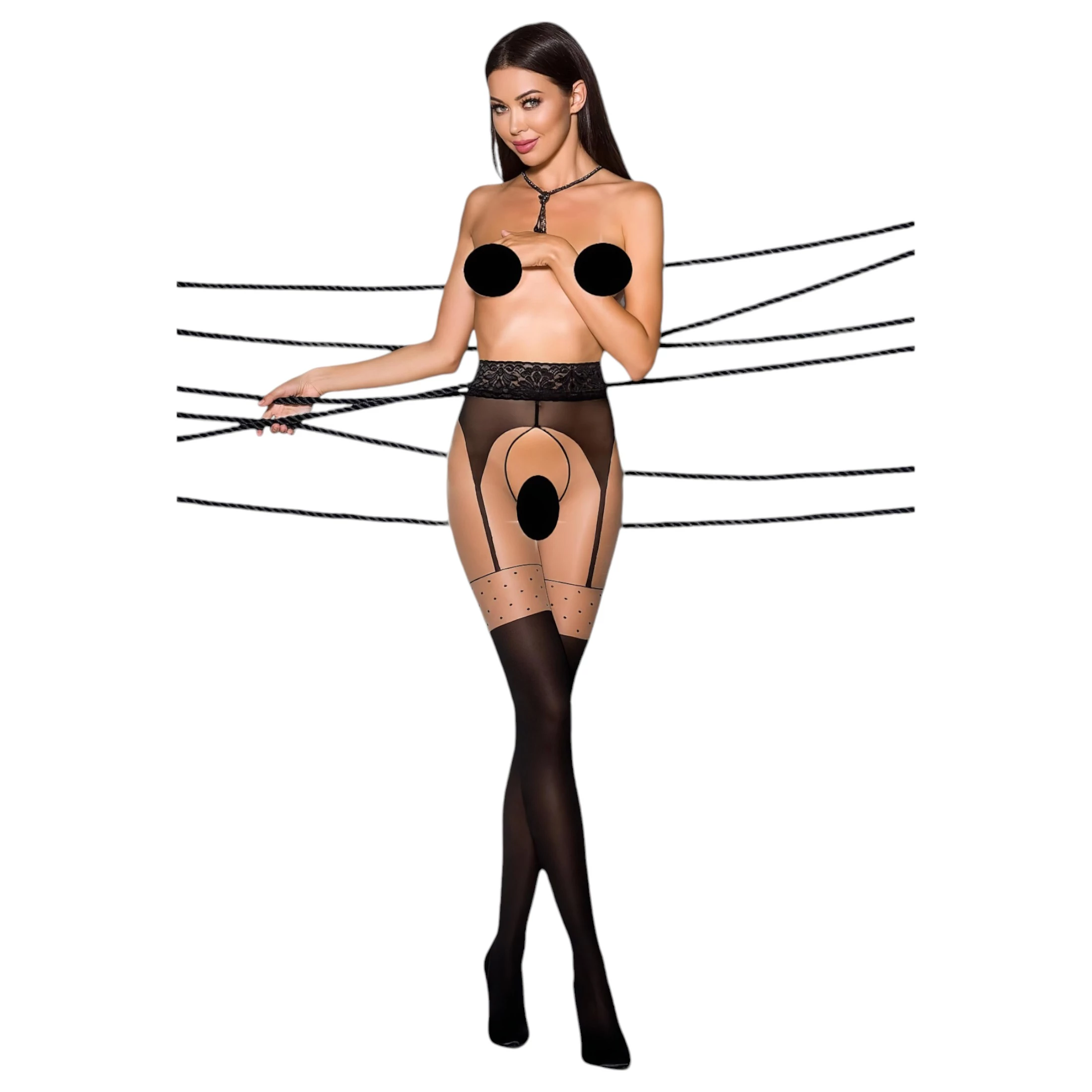 - A csípő részen és a comboknál harisnyatartó mintával díszítve - mitha csipkés harisnyatartós kialakítású lenne, vékony pántokkal