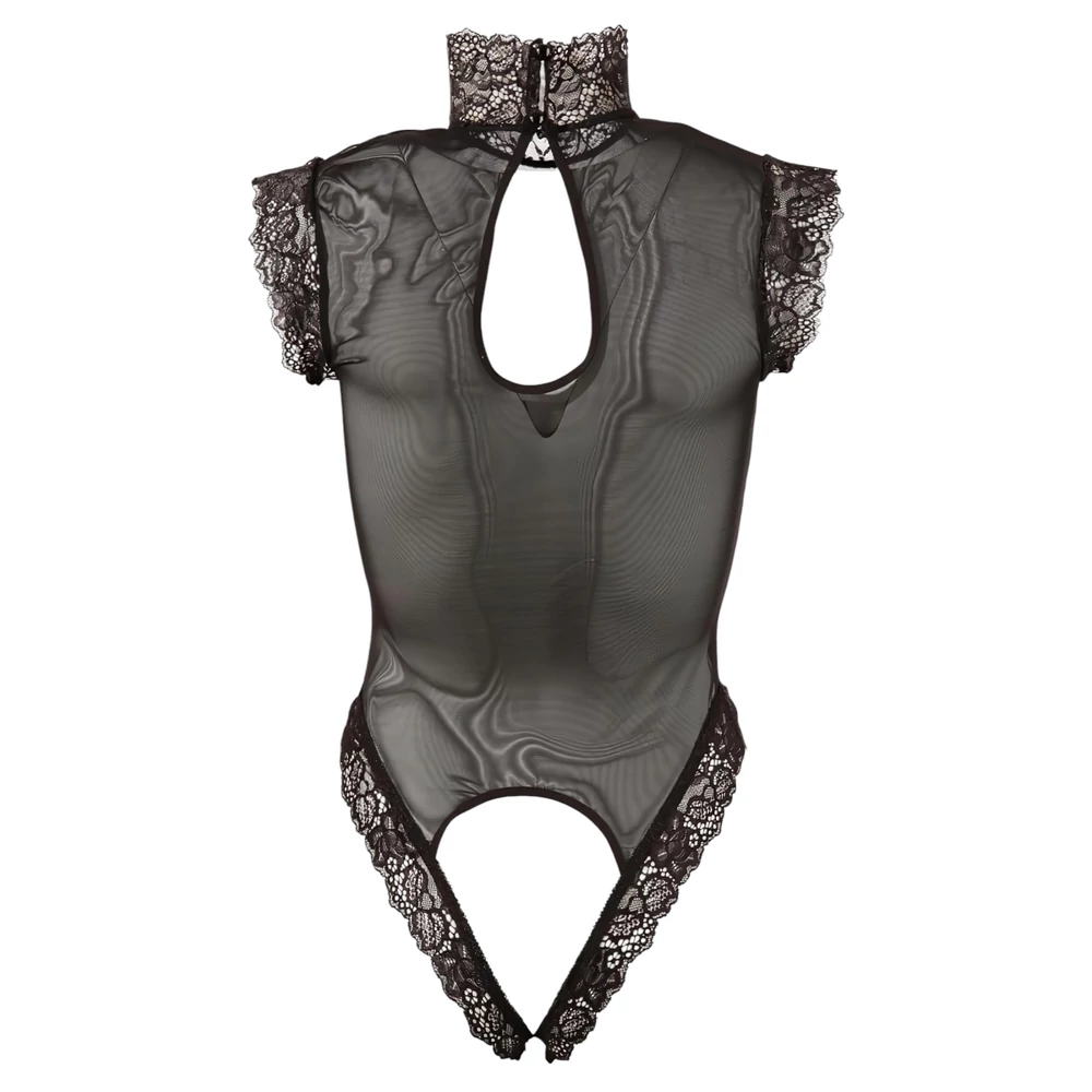 - 1 db fekete, átlátszó body állógallérral és csipkés részletekkel