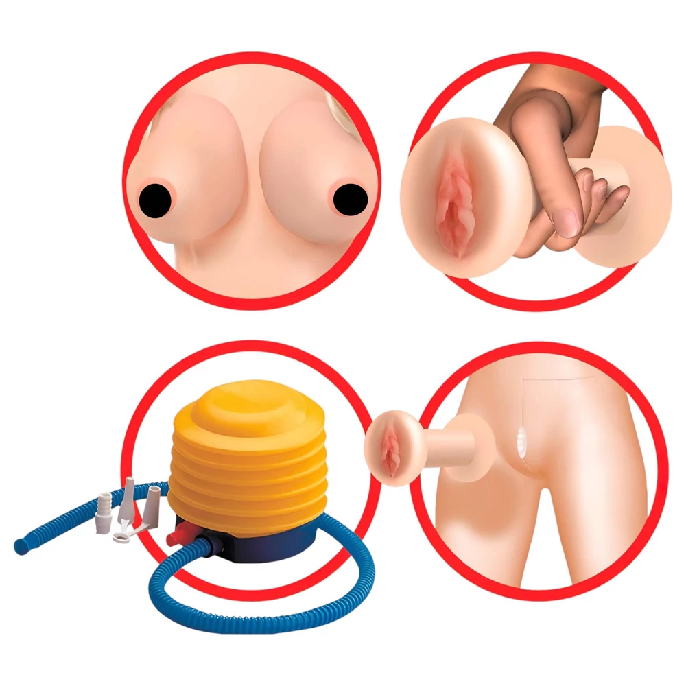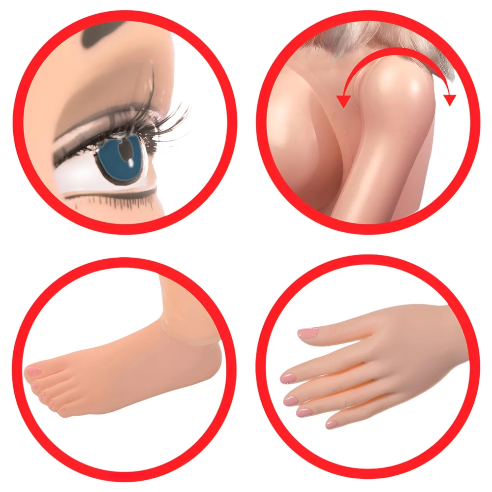 - Életnagyságú méret, kerek és telt mellek, forgatható karok