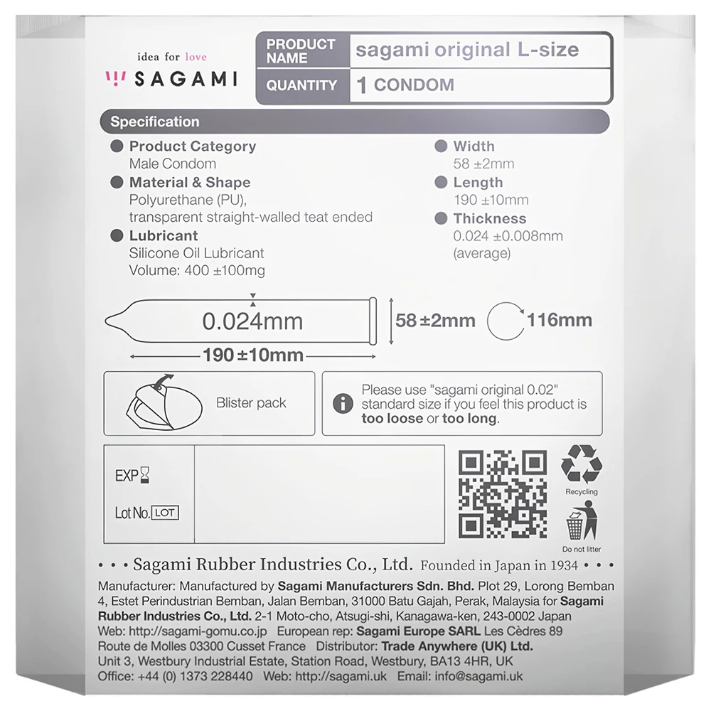 A Sagami Original 0.02 L-Size (1 db) egy ultravékony, latexmentes óvszer, amely természetes, bőr-bőr érzetet biztosít egyetlen alkalomra.