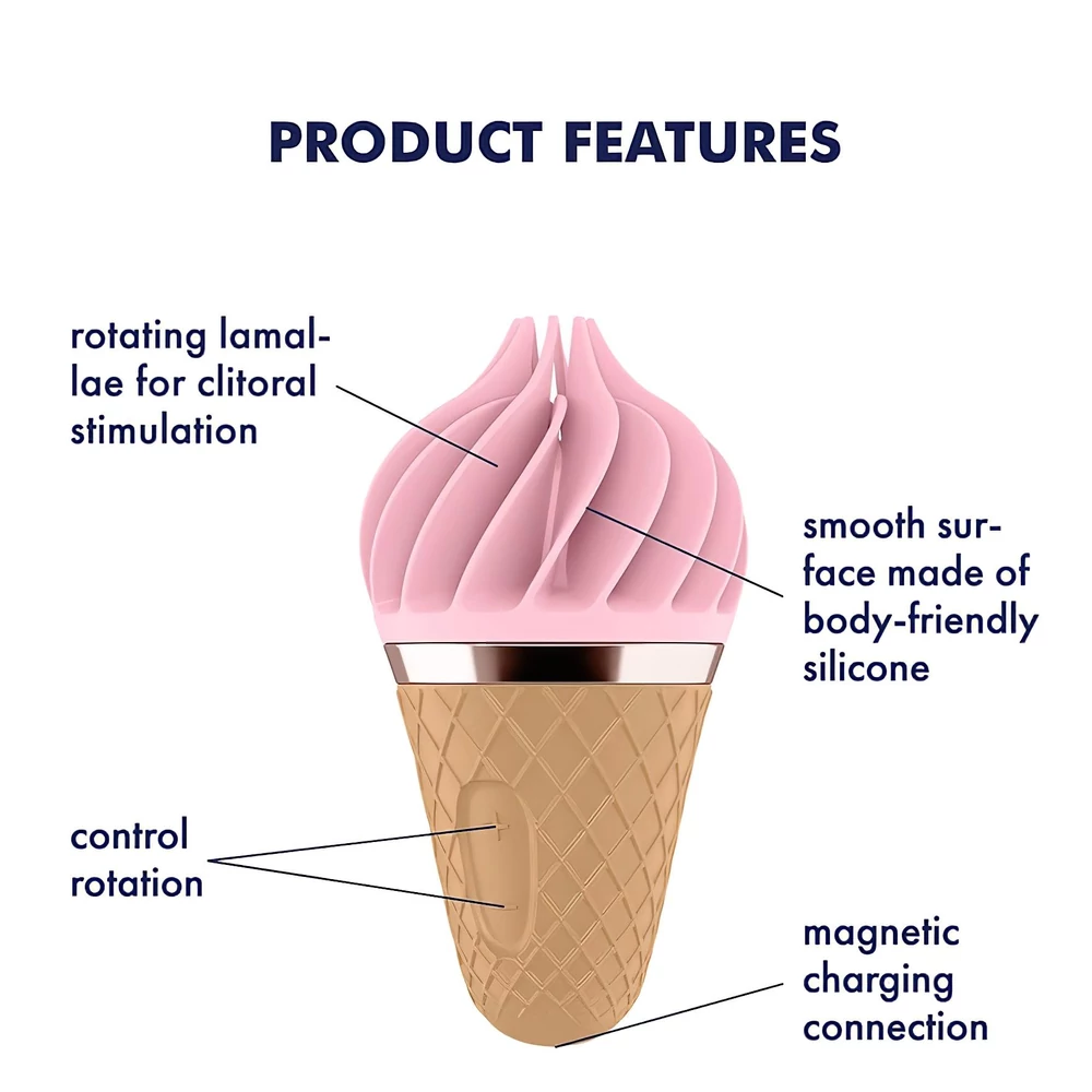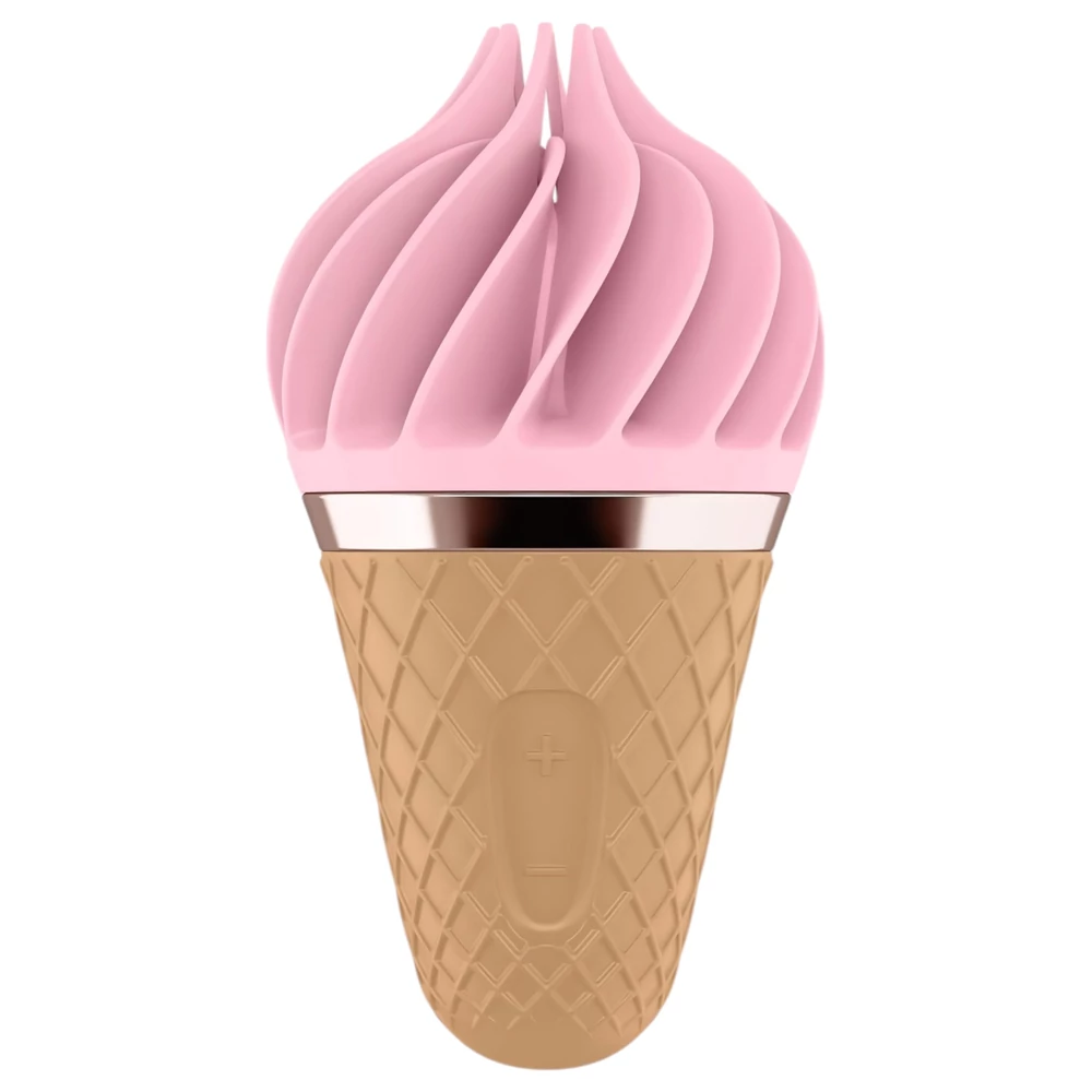 - A Satisfyer Sweet Treat fagyinak álcázott vibrátor, diszkrét formájának köszönhetően dísztárgyként is megállja a helyét, miközben titokban a szoba rejtekében bizsergető élményt nyújt.