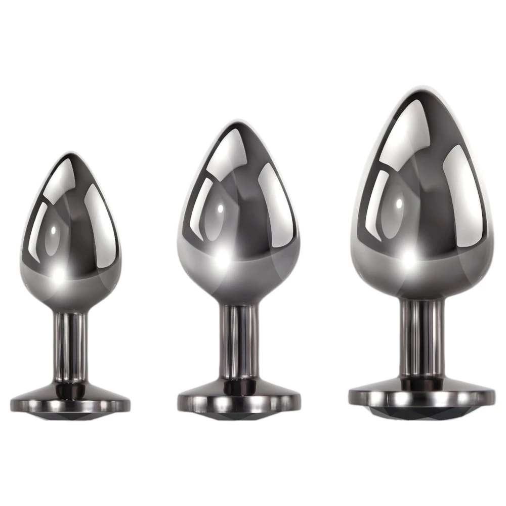 Ez a háromrészes, prémium minőségű fém anál plug szett tökéletes választás mind kezdők, mind haladók számára, akik szeretnék fokozatosan felfedezni az anális örömöket. A gyönyörű, gyémánt hatású talp nemcsak esztétikus, de a biztonságos használatot is garantálja, miközben a kúpos forma könnyed és kényelmes behatolást biztosít.