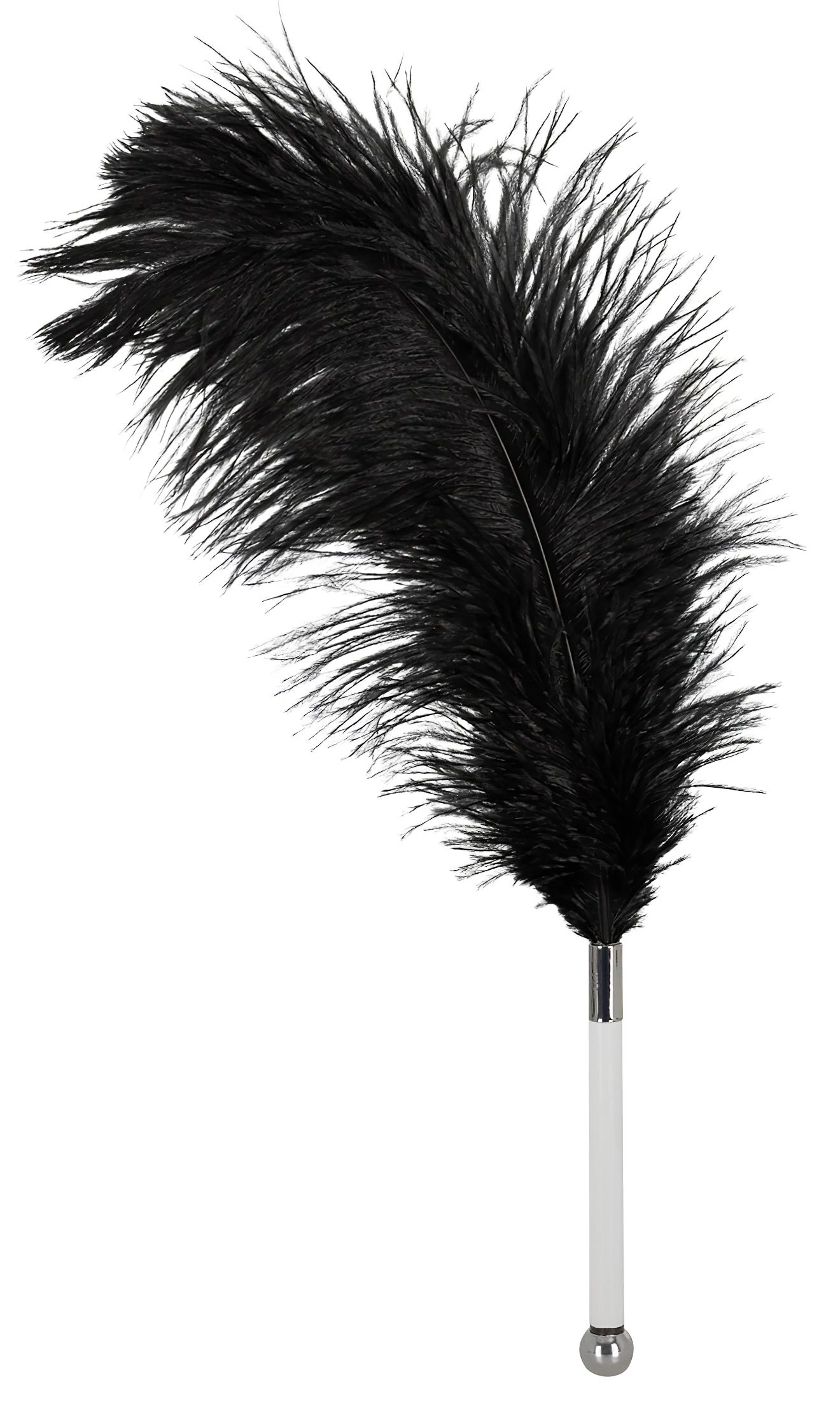 Valódi strucctollból készült cirógató, különleges, gyönyörűen kidolgozott, lekerekített, áttetsző acrylból készült, rövid nyéllel és rajta ezüst színű dísszel.