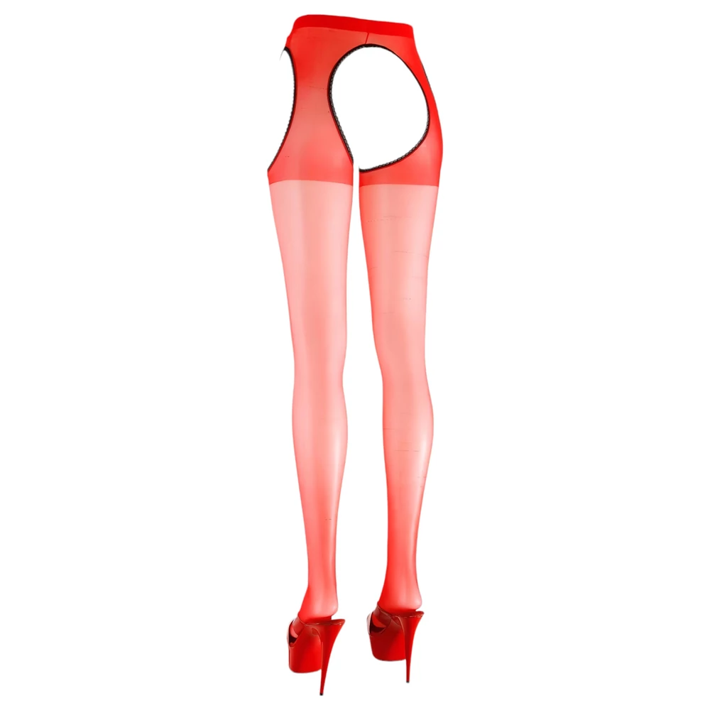 Ez a lenyűgöző piros, nyitott lábközű strapsz-harisnya a tökéletes választás minden érzéki megjelenéshez.