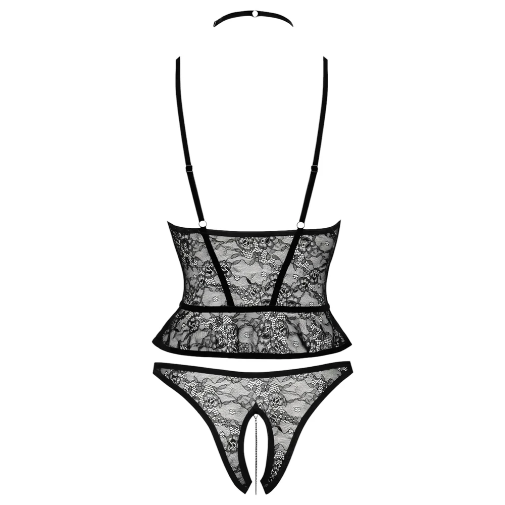 A puha csipke anyag kényelmes viseletet biztosít, miközben érzékien kiemeli a nőiességet. A mell alatti merevítés gondoskodik a szép tartásról, a középen cipzáras kialakítás pedig praktikus és szexi egyszerre. A teljesen nyitott tanga ezüst lánccal díszítve rendkívül csábító, míg a levehető nyakpánt ékköves részletekkel luxus hatást kelt.