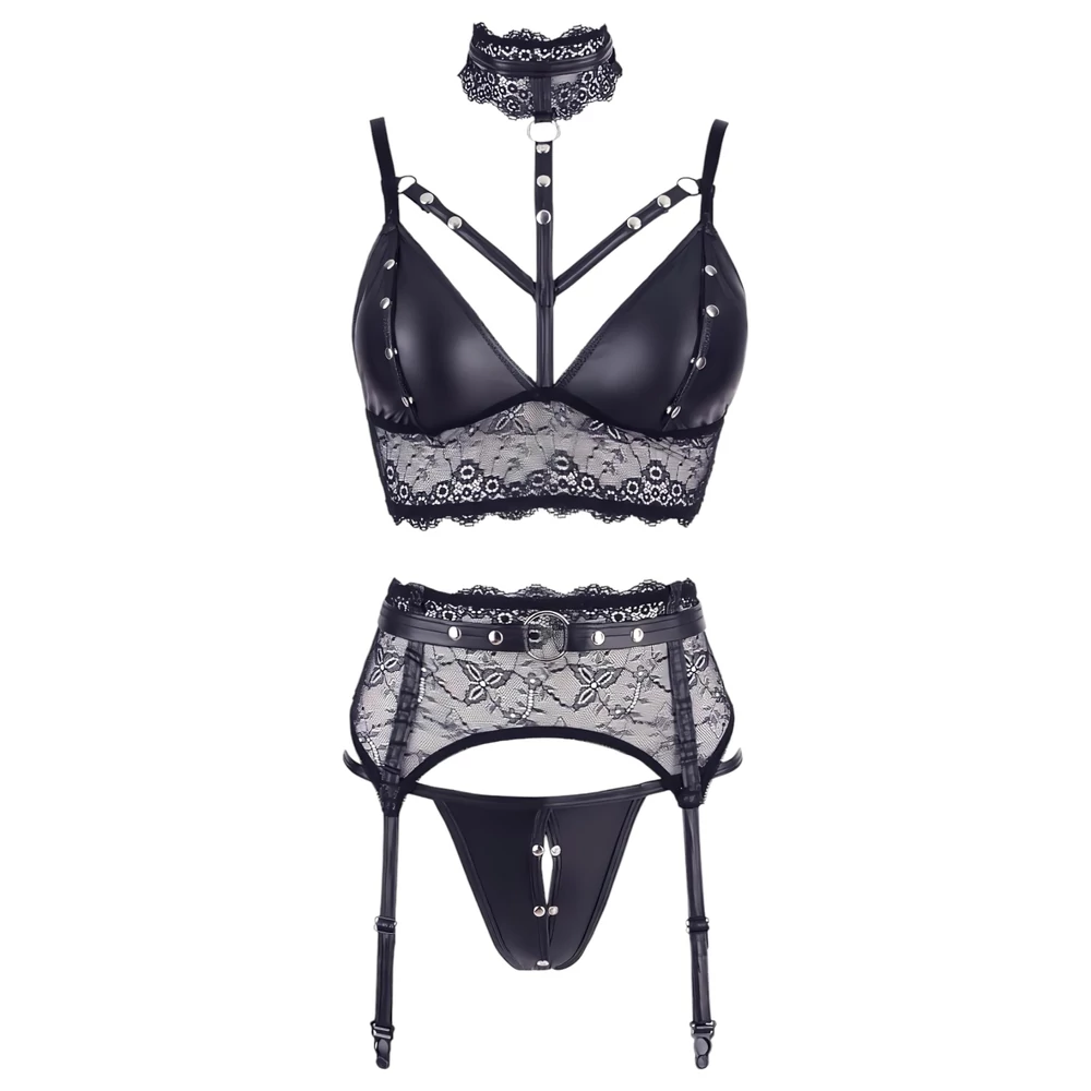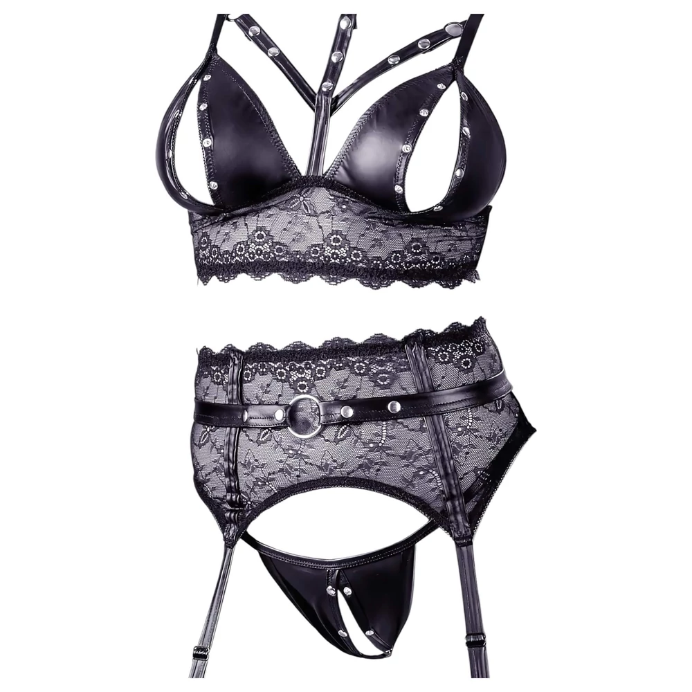 Fényes pántok és lágy csipke kombinációjával készült szett, mely szegecsekkel díszítve teszi igazán különlegessé megjelenésed!