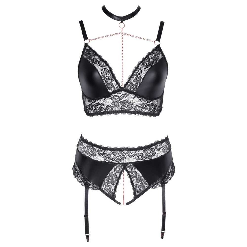 A Cottelli Curves – láncos csipke melltartó és nyitott harisnyatartós bugyi szett (fekete) egy merész, erotikus és variálható fehérneműszett, amely a matt fényű anyag, a csipke, valamint a levehető láncos kiegészítők kombinációjával teremti meg a tökéletes csábítást.