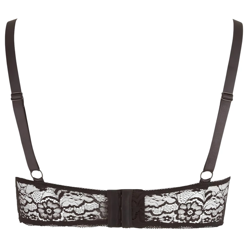 - Virágmintás, puha csipkével borított elülső rész, amely hátul önállóan folytatódik, így a csipke áttetsző anyagán átsejlik a hát csupasz bőre.