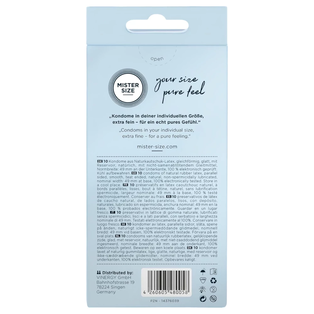 - 10 darab Mister Size óvszer 49 mm-es méretben, külön-külön csomagolva.