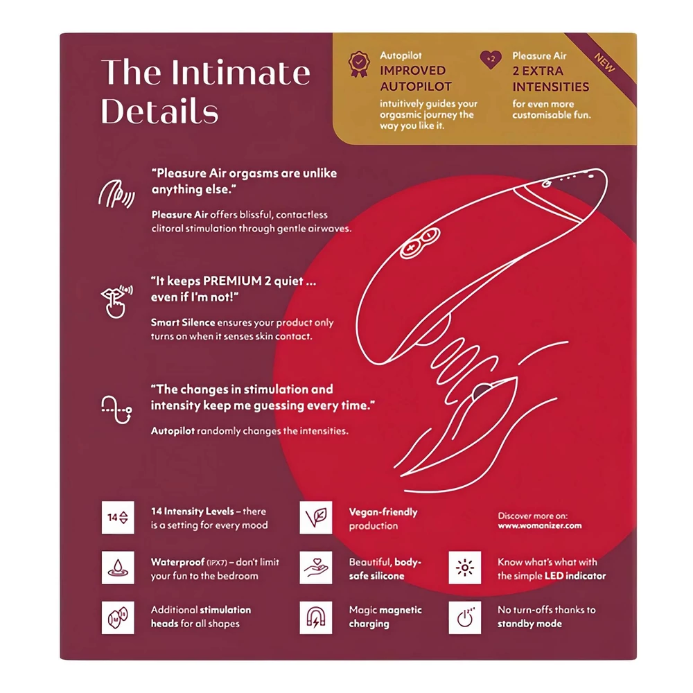 A Womanizer Premium 2 a prémium kategóriás kényeztetők ékköve, amely a 14 intenzitási szintnek, a Smart Silence érzékelőnek és az Autopilot módnak köszönhetően minden alkalommal egyedi orgazmust biztosít. Elegáns formája, bőrbarát anyagai és vízálló kialakítása révén bárhol és bármikor maximális élményt nyújt.