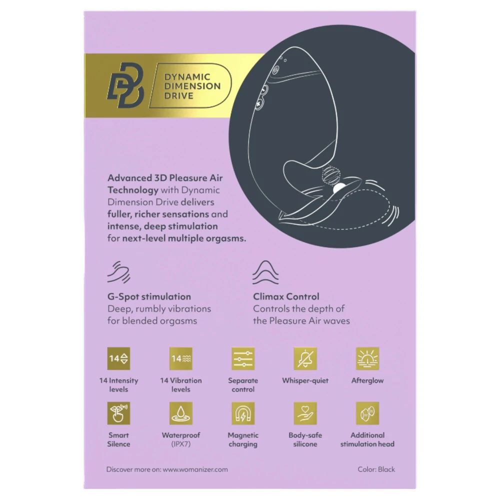 Ez a luxus kényeztető a Womanizer ikonikus Pleasure Air technológiáját ötvözi a mély, lüktető G-pont vibrációval. Az eredmény egy intenzív, többszörös orgazmust ígérő stimuláció, amely egyszerre kényezteti a csiklót és a G-pontot. A Dynamic Dimension Drive technológia gazdagabb, teltebb érzéseket nyújt, miközben a Climax Control lehetővé teszi az orgazmus hullámainak teljes irányítását.