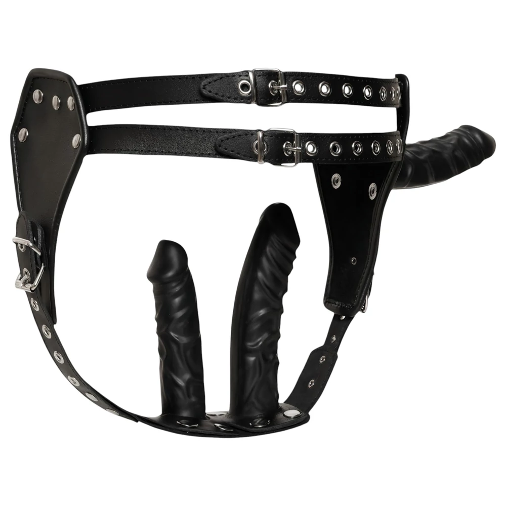 - Anyag: Fém, valódi bőr (alsó), 100% latex (dildók)
